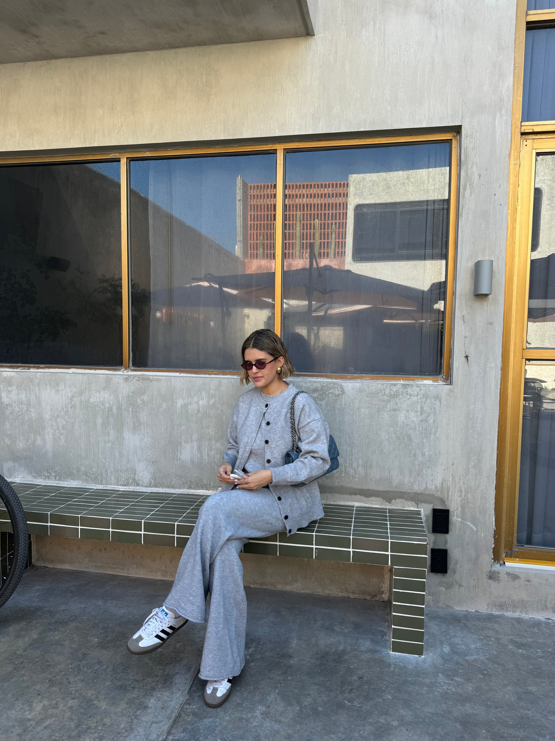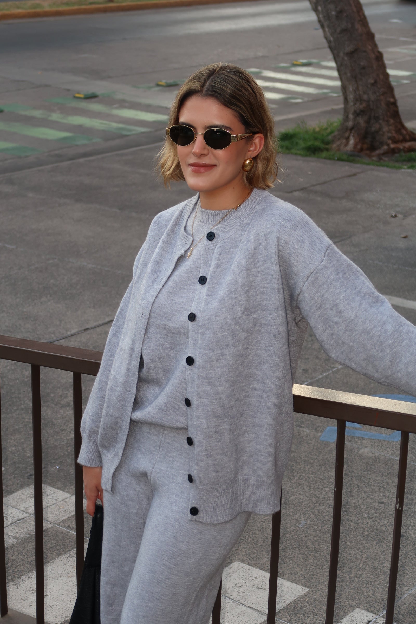 Pantalón con resorte, cuello redondo manga corta y suéter manga larga con botones